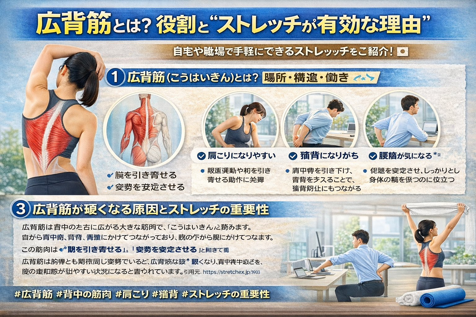 もちろん、すべての不調が広背筋だけで説明できるわけではありません。ただ、「背中が突っ張る」「腕が上げづらい」と感じる場合、広背筋ストレッチが役立つ可能性はあると紹介されています。