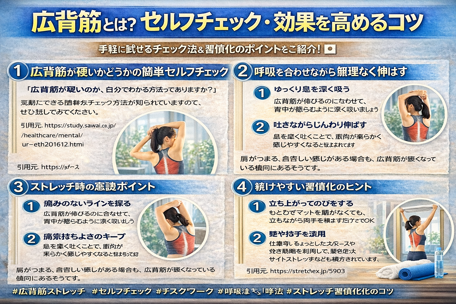 そんな声をよく聞きます。大切なのは、“やること”よりも“感じ取ること”。ここでは、広背筋が硬いかどうかのセルフチェックと、効果を高めるためのポイントをまとめます。参考ページでも、呼吸や姿勢との組み合わせが重要と言われています。