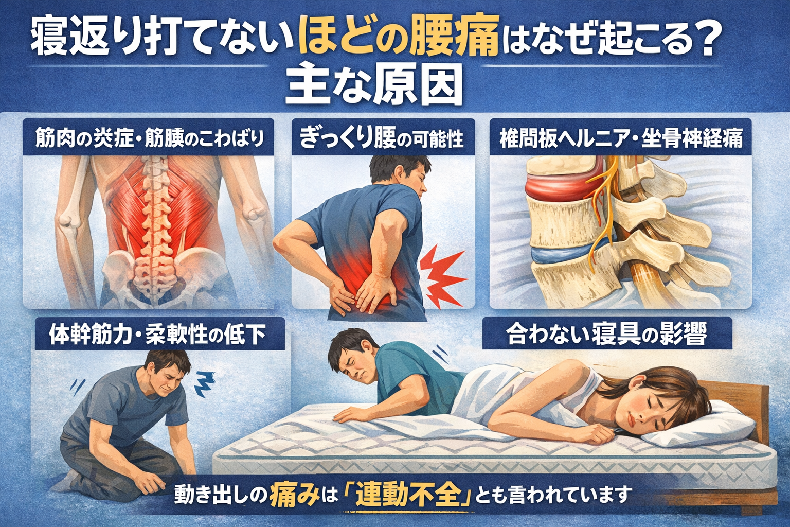 ここでは、寝返り打てないほどの腰痛の主な原因をわかりやすく整理していきます。