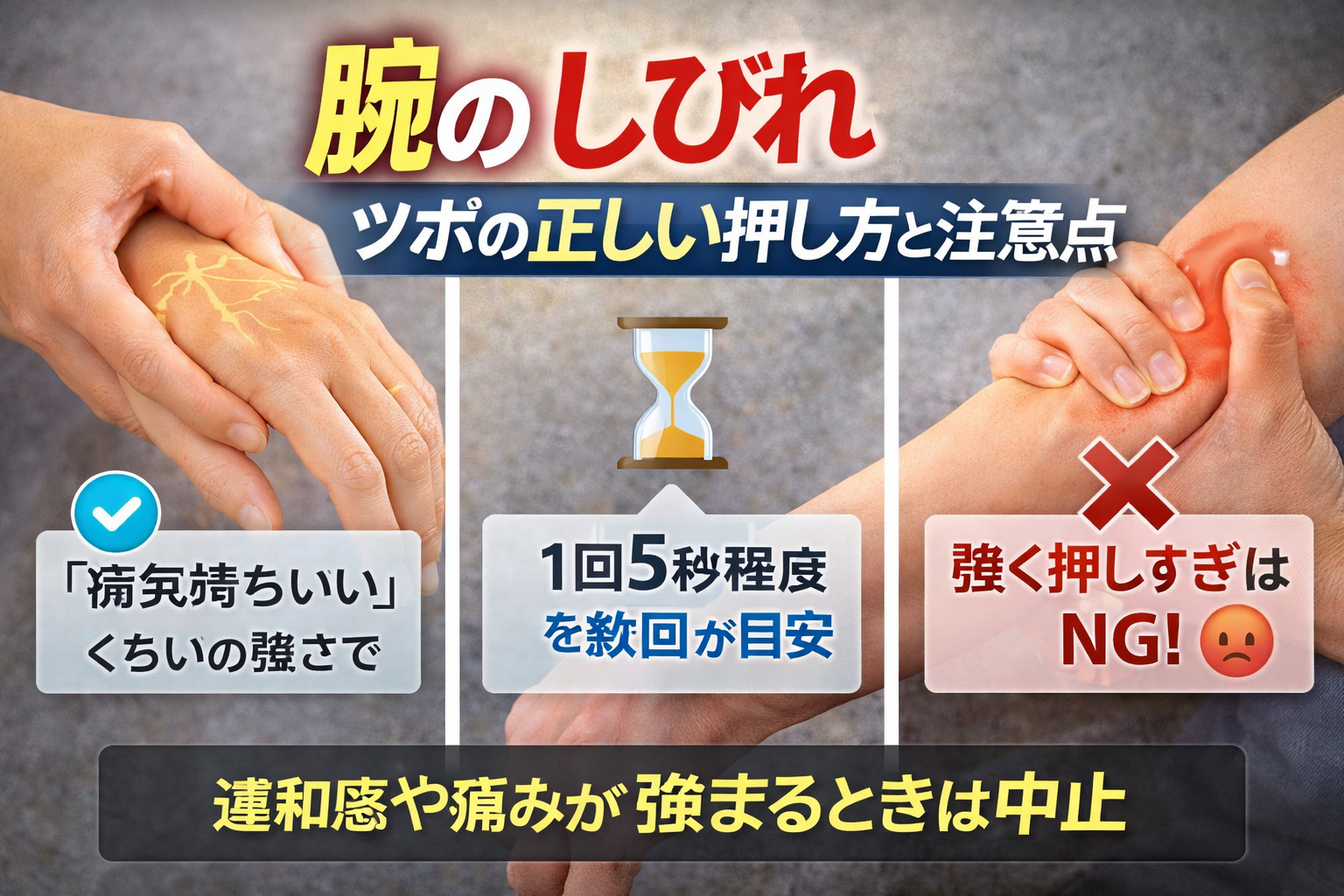 まず、強く押しすぎること。これは多くの参考記事でも注意されていて、炎症や違和感につながる可能性があると言われています。また、しびれが強いときや原因がはっきりしない場合に無理に続けるのも避けたほうがいいとされています。
