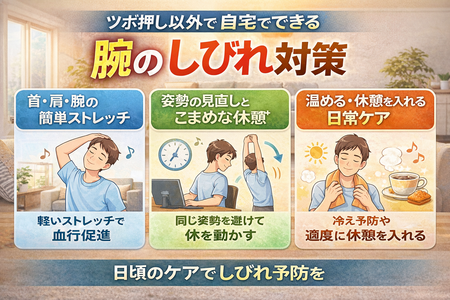 温める・休憩を入れるなど日常ケア