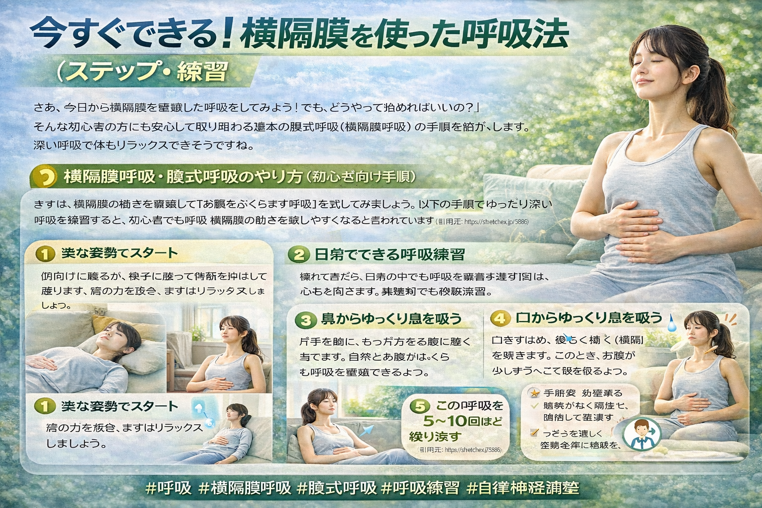 そう感じる方も多いですが、実は特別な道具がなくても始められると言われています。ここでは、呼吸 横隔膜を意識した初心者向けの呼吸法を、できるだけシンプルにまとめます。