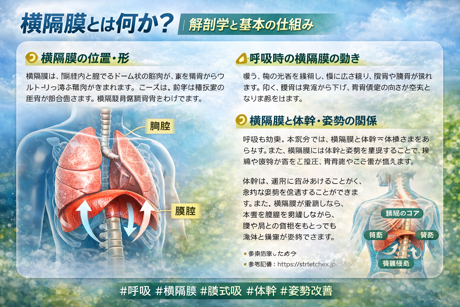 横隔膜は呼吸の中心的な筋肉ですが、姿勢や生活習慣の影響を受けやすいとも解説されています。
