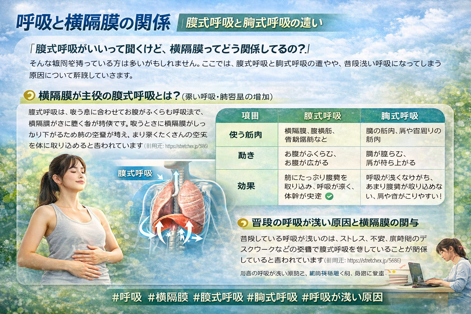 横隔膜が十分に動きづらい場合、胸式呼吸が優位になりやすいと言われています。