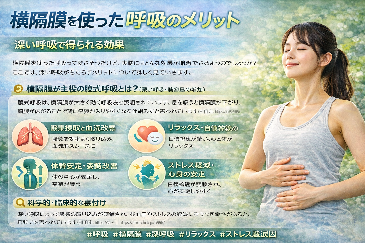 そんな疑問を持つ方もいらっしゃいますよね。呼吸 横隔膜の関係を意識した“深い呼吸”には、いくつかのメリットがあると言われています。
