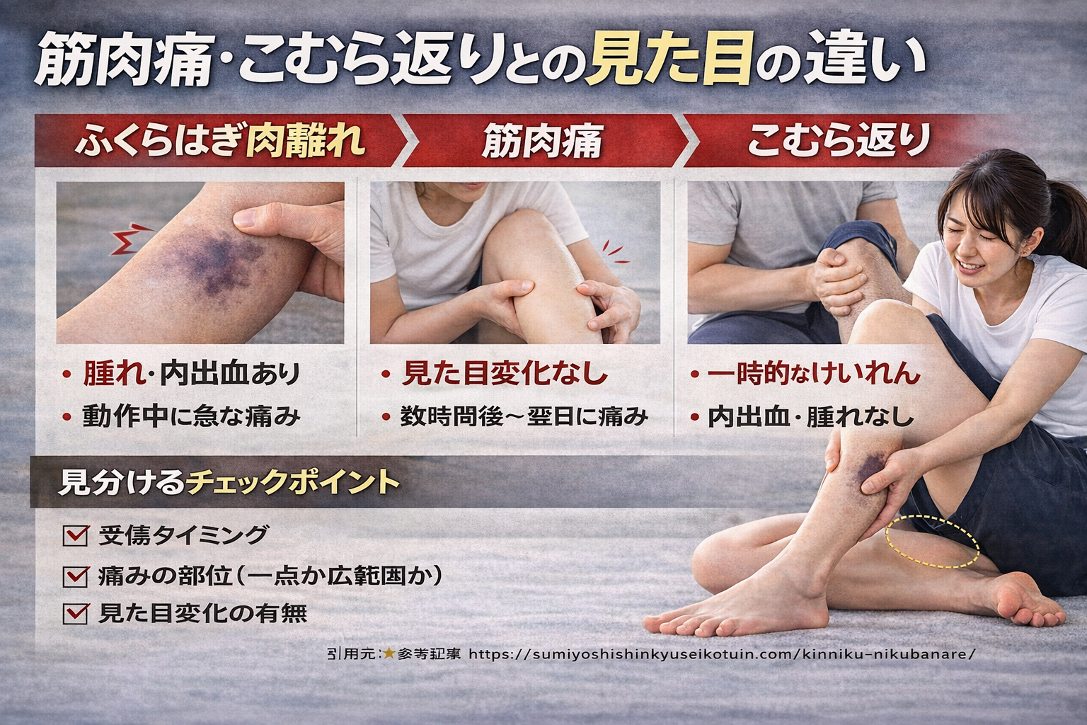 一方で肉離れの場合は、痛みとあわせて「見た目の変化」が出てくることがポイントです。つまり、「痛み+外見の変化」がそろっているかどうかが判断のヒントになると言われています。