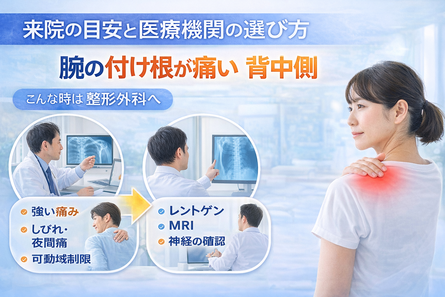 「腕の付け根が痛い 背中側」、しばらく様子を見てもいいのか、それとも来院したほうがいいのか——ここは迷いますよね。無理に我慢する必要はありませんが、判断の目安を知っておくと安心につながると言われています。