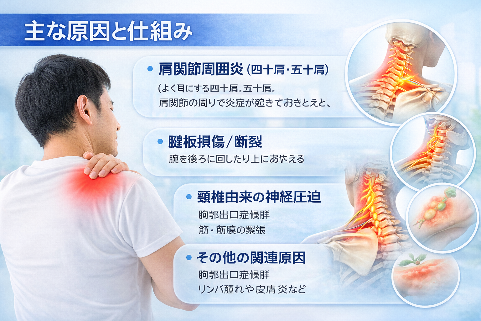 「肩が悪いのかな?」と思っていても、首や神経が関係しているケースもあるようです。ここでは、よく挙げられる原因を整理してみましょう。
