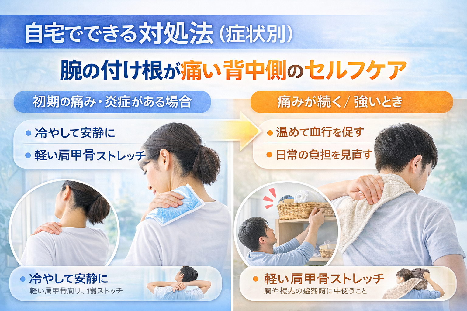 「腕の付け根が痛い 背中側」と感じたとき、まず考えるのは「今すぐ何をすればいいの?」という点ですよね。症状の強さや時期によって、対応の仕方は少し変わると言われています。ここでは、自宅でできるケアを整理していきましょう。