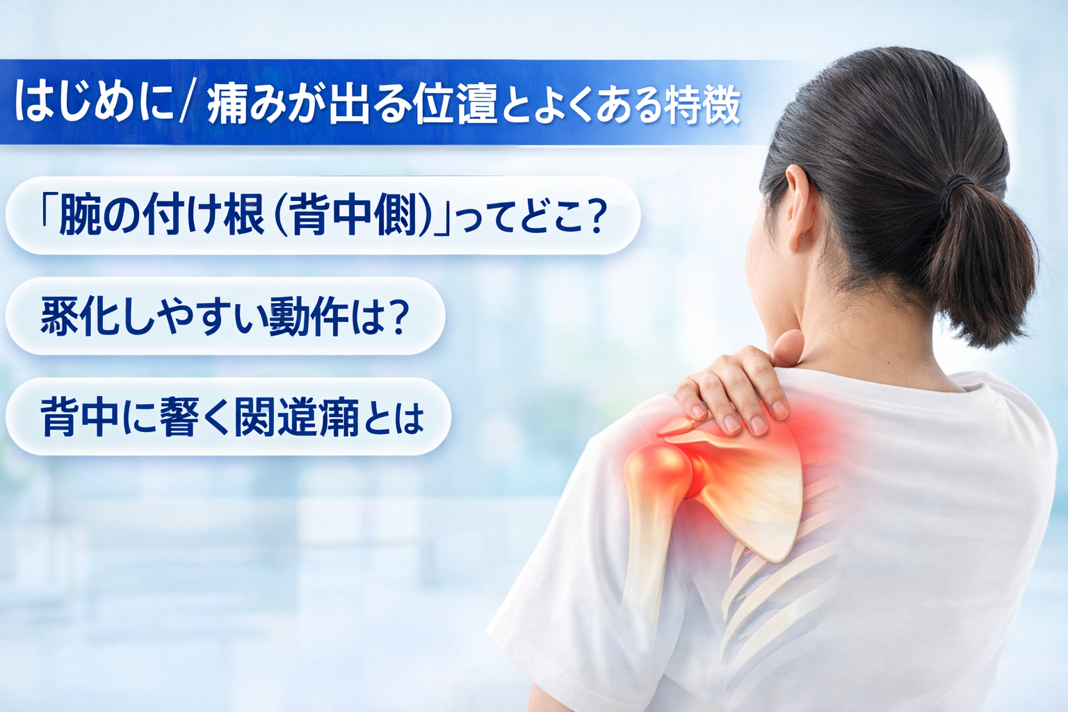 「腕の付け根が痛い 背中側」と感じたとき、実は原因はひとつとは限らないと言われています。
