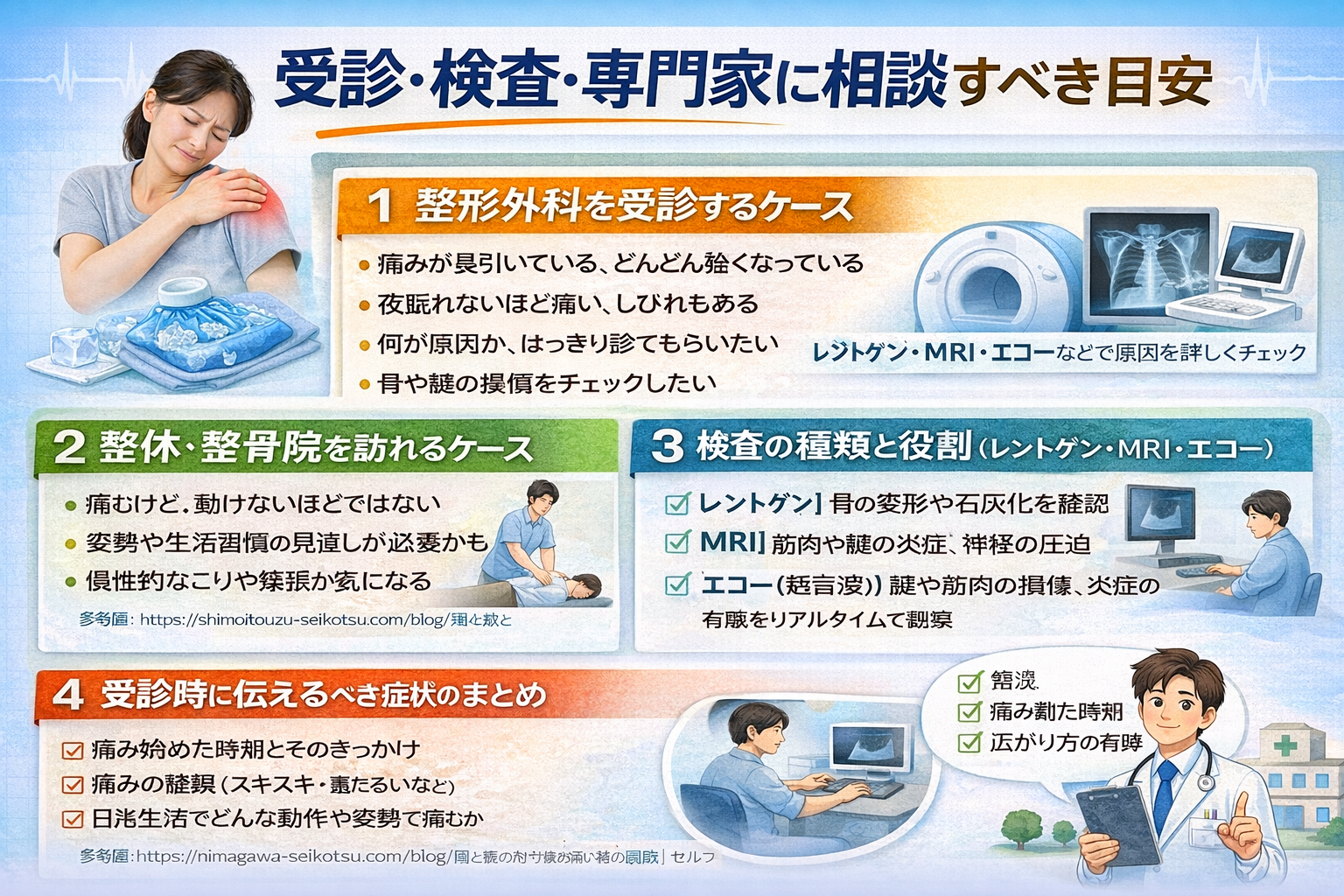 「前側だから同じ対処でいい」と思い込まず、痛む場所をざっくり分けて考えることが大切だと言われています。もし、「場所がよくわからない」「だんだん範囲が広がってきた気がする」と感じたら、無理せず専門家に相談するという選択肢も安心につながりますよ。