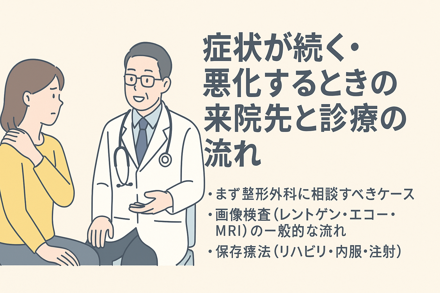 上位記事でも、こうした“長く続く痛み”に対しては 整形外科で状況を確認する流れ を丁寧に紹介していることが多く、読者に安心感を与える締め方が採用されています。
