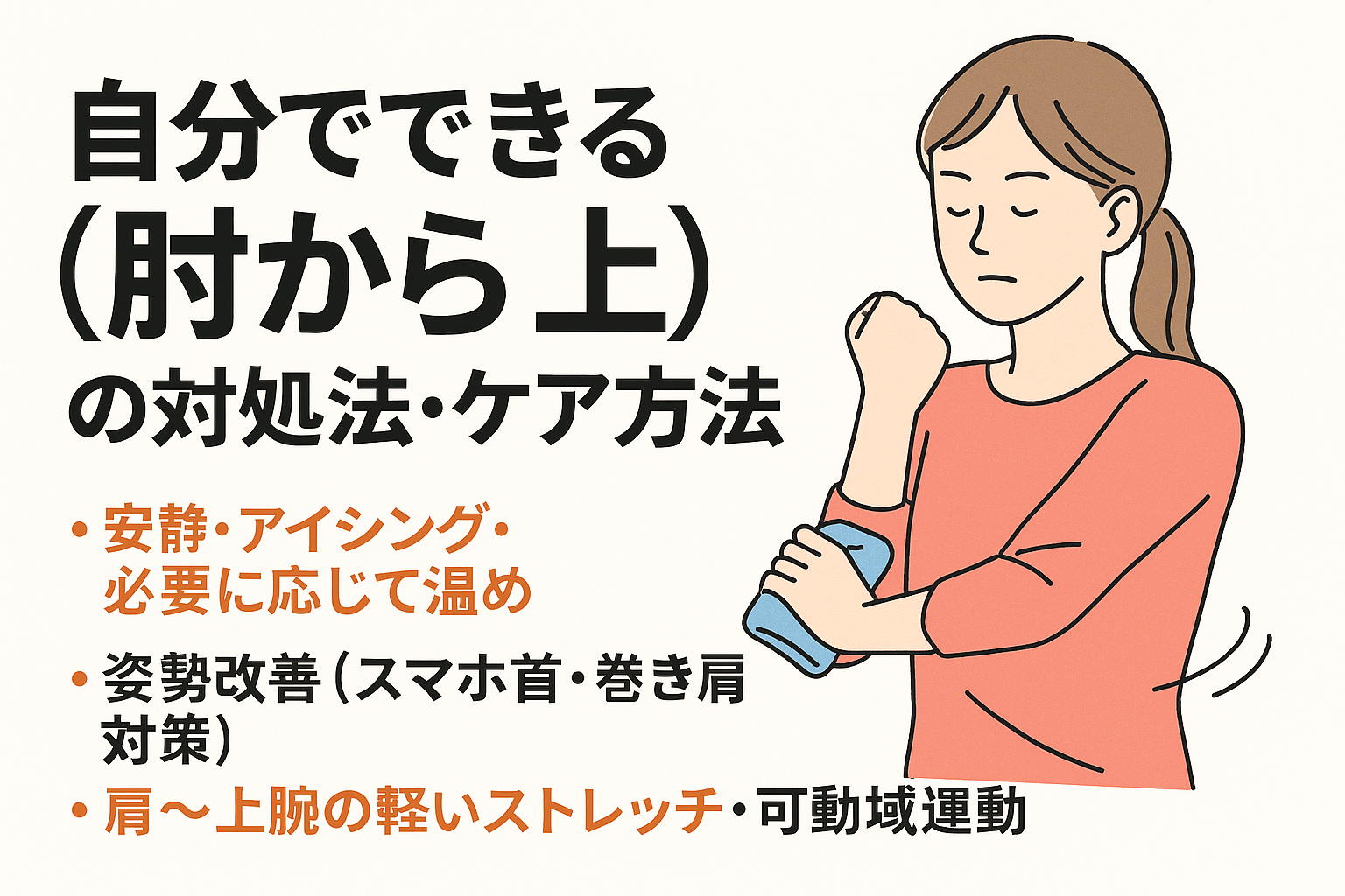 #右腕のセルフケア#肘から上の痛み#アイシングと温め#姿勢改善ポイント#やさしいストレッチ