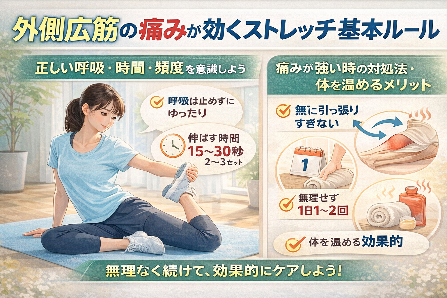 外側広筋を伸ばすときは、呼吸を止めずにゆっくり行うことが基本だと言われています。