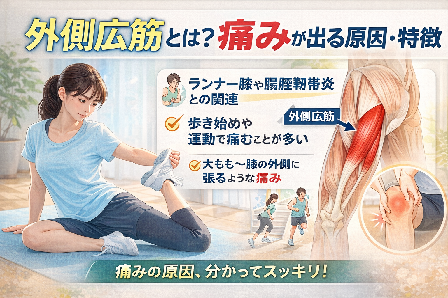 また、フォームの乱れや片脚に偏った動きのクセがあると、外側広筋に負担が集中しやすくなるとも言われています。