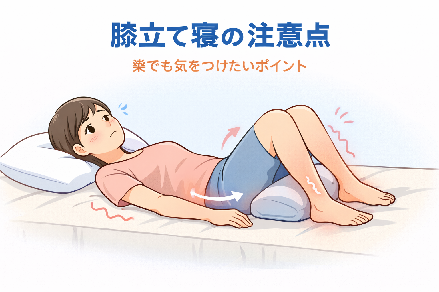 膝立て寝はあくまで姿勢の選択肢の一つです。違和感が出た場合は、途中で足を下ろしたり、寝返りを妨げない工夫も大切だと考えられています。