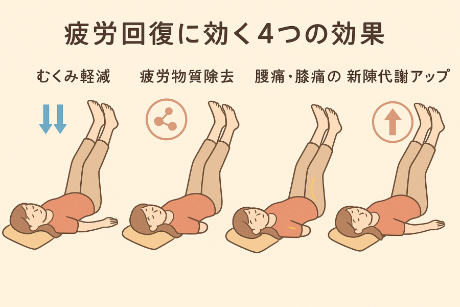 足を上げる姿勢によって循環が整うと、これらが流れやすくなり、疲労回復をサポートする可能性があるようです。