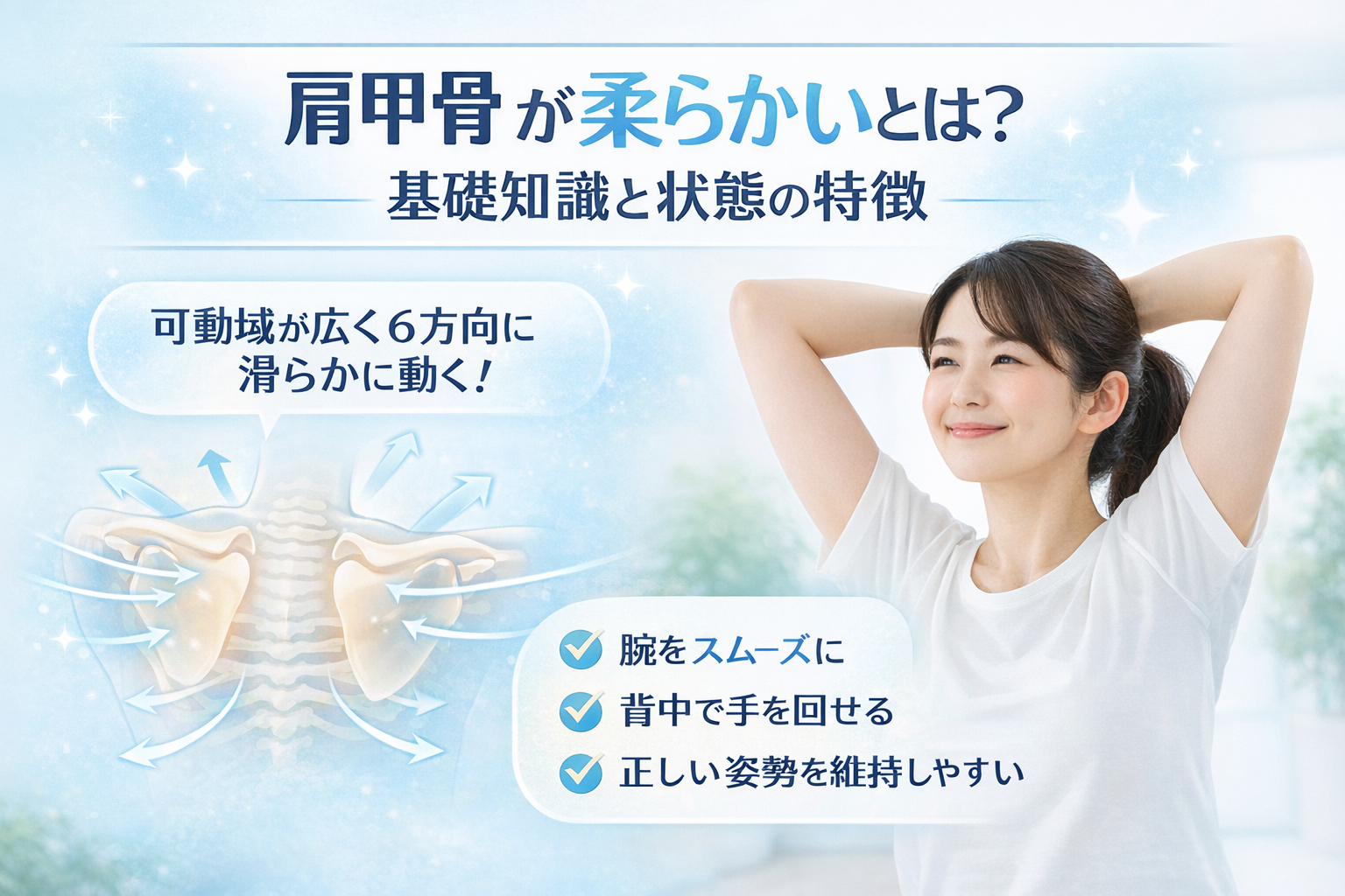 実際によくいただく質問です。肩甲骨 柔らかい メリットは、見た目だけでなく、日々の体の使いやすさにも関係すると言われています。ここでは、健康面と生活面の変化について整理していきますね。