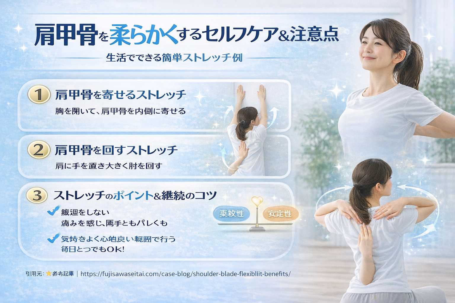 つまり、柔軟性と安定性のバランスが大切です。動くべきところは動き、支えるところは支える。この感覚を意識することが、肩甲骨のセルフケアでは重要だと紹介されています。