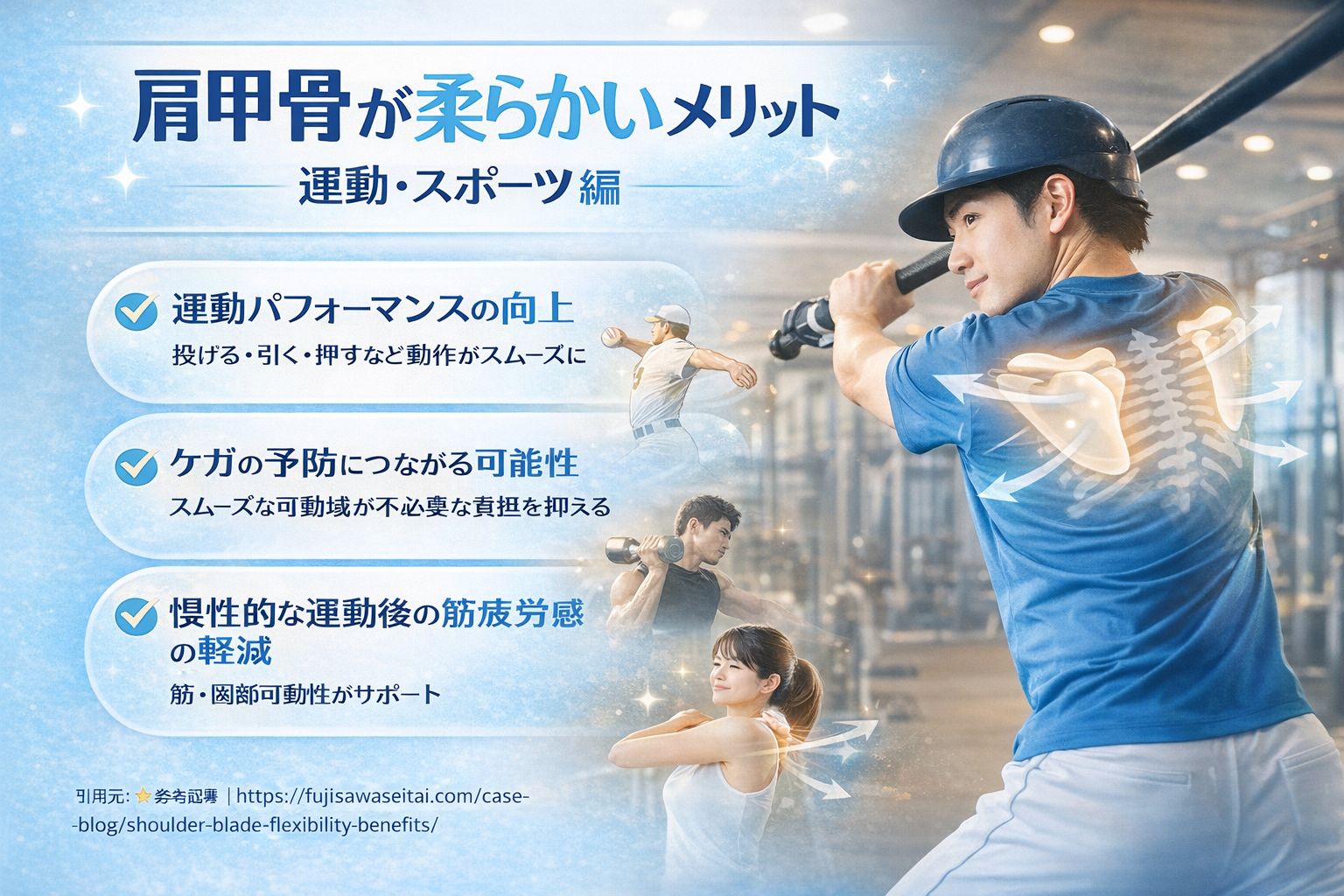 一方、肩甲骨がなめらかに動けば、衝撃や負荷が分散されやすくなる可能性があります。もちろん、すべてのケガを防げるわけではありません。ただ、「可動域の確保はコンディション維持に重要」と紹介されているケースは少なくありません。
