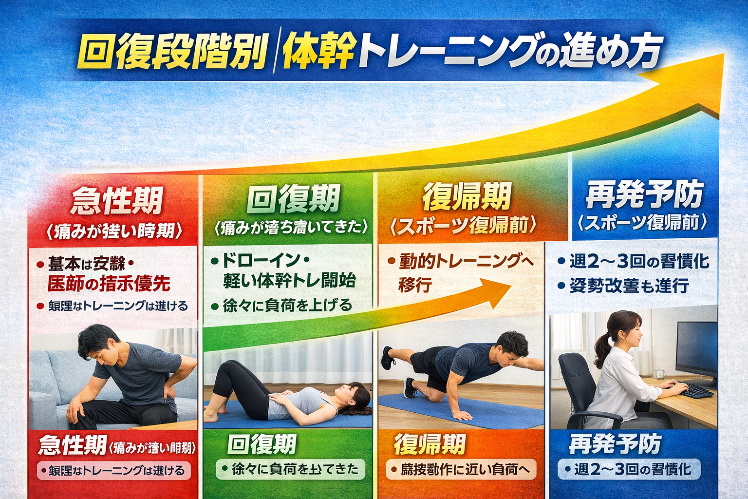 さらに、再発予防の観点からも体幹トレーニングは重要とされており、「痛みが落ち着いたあとこそ大切」と言われることもあります。