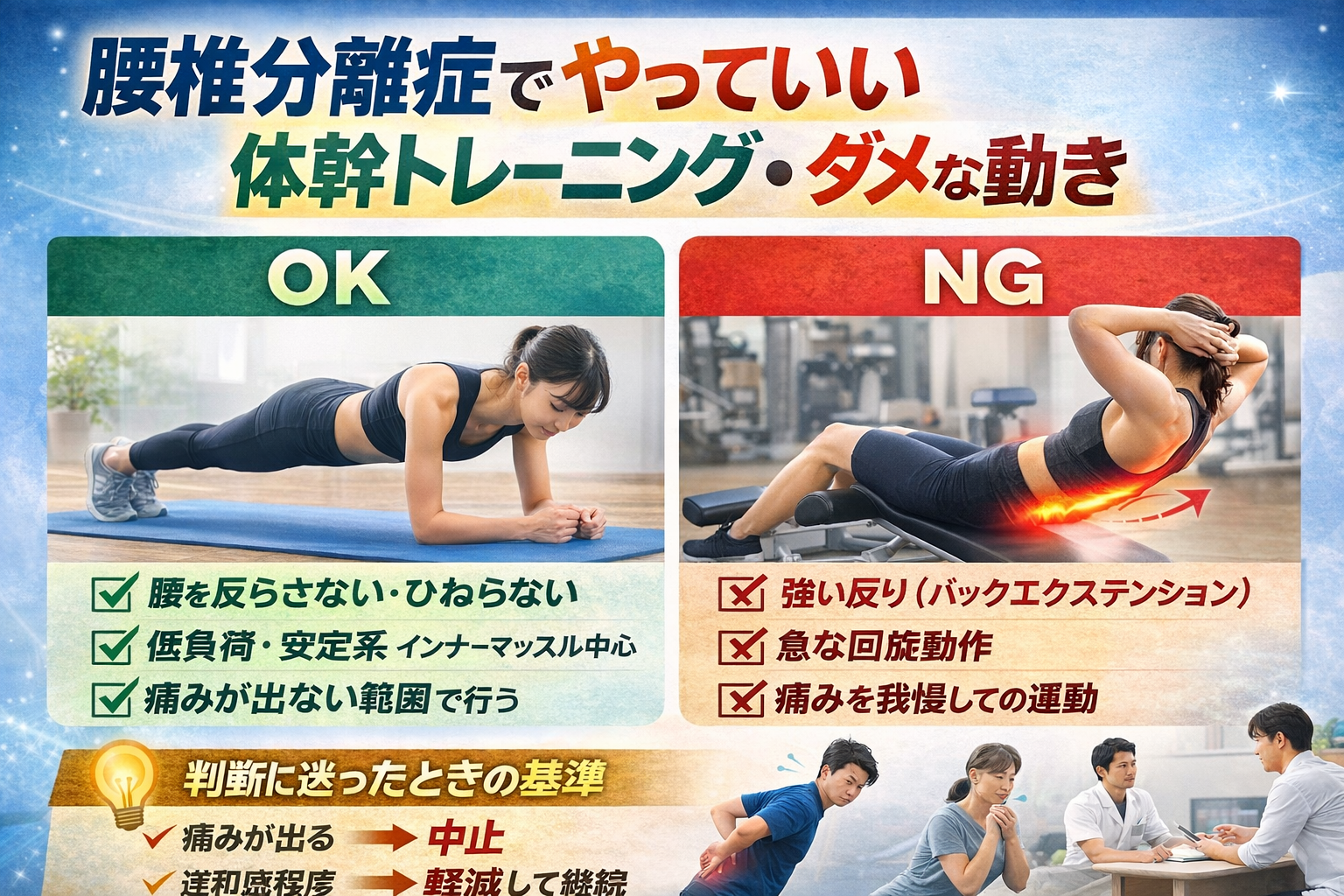 そんな声、よく聞きます。腰椎分離症のときは“やる内容”よりも、“どうやるか”がかなり大切だと言われています。ここでは、安全に続けるためのポイントと、避けたい動きを整理していきます。
