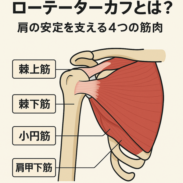 そう感じている方は少なくないと思います。ローテーターカフとは、肩関節を安定させるために働く4つの筋肉と腱の集まりのことを指します。具体的には、棘上筋・棘下筋・小円筋・肩甲下筋の4つで構成されており、これらが協力しながら肩の動きを支えていると言われています。