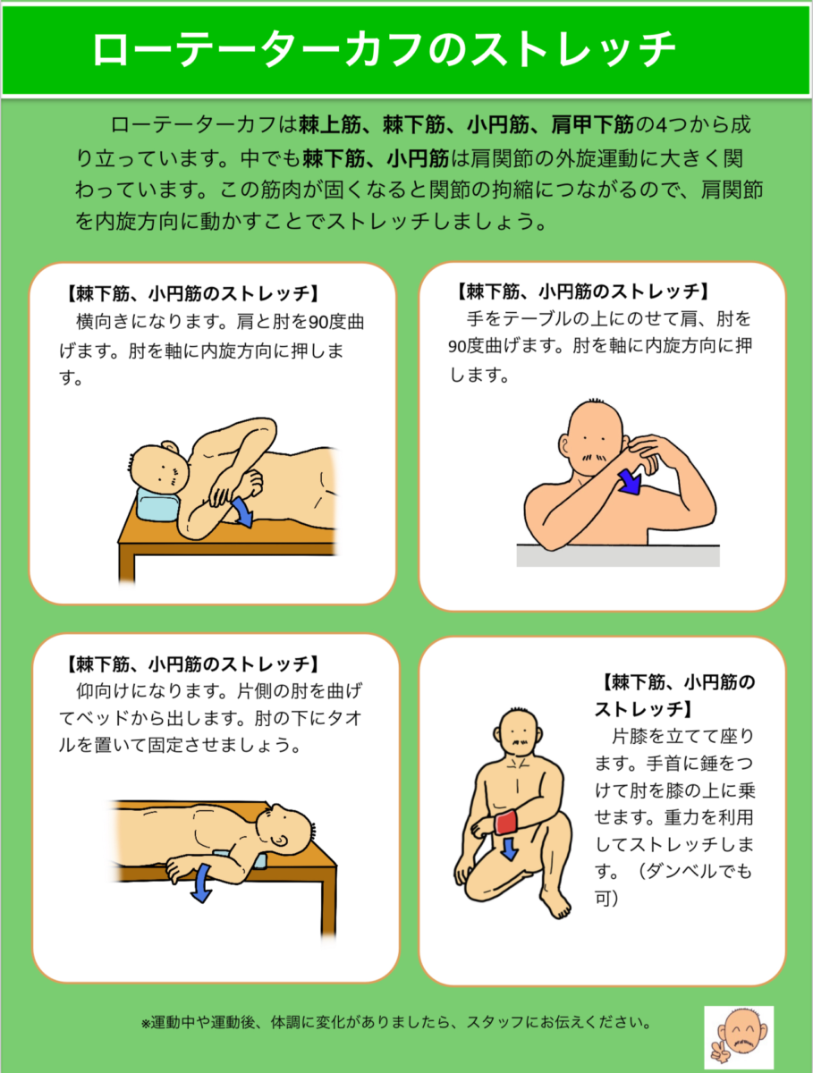 運動前に軽く体を温める、日常的に肩を大きく動かす習慣をつくるなど、予防の視点でのケアも大切だと説明されています。